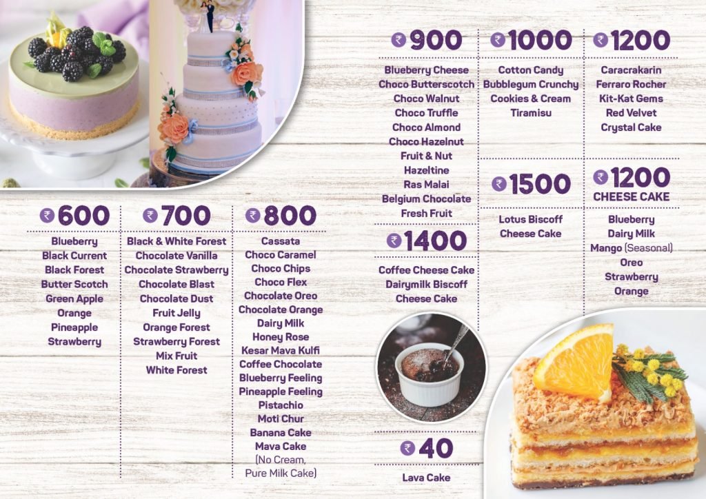 Cassata, Choco Caramel, Choco Chips, Choco Flex, Chocolate Oreo, Chocolate Orange, Dairy Milk, Honey Rose, Kesar Mava Kulfi, Coffee Chocolate, Blueberry Feeling, Pineapple Feeling, Pistachio, Moti Chur, Banana Cake, Mava Cake, (No Cream Pure Milk Cake)
